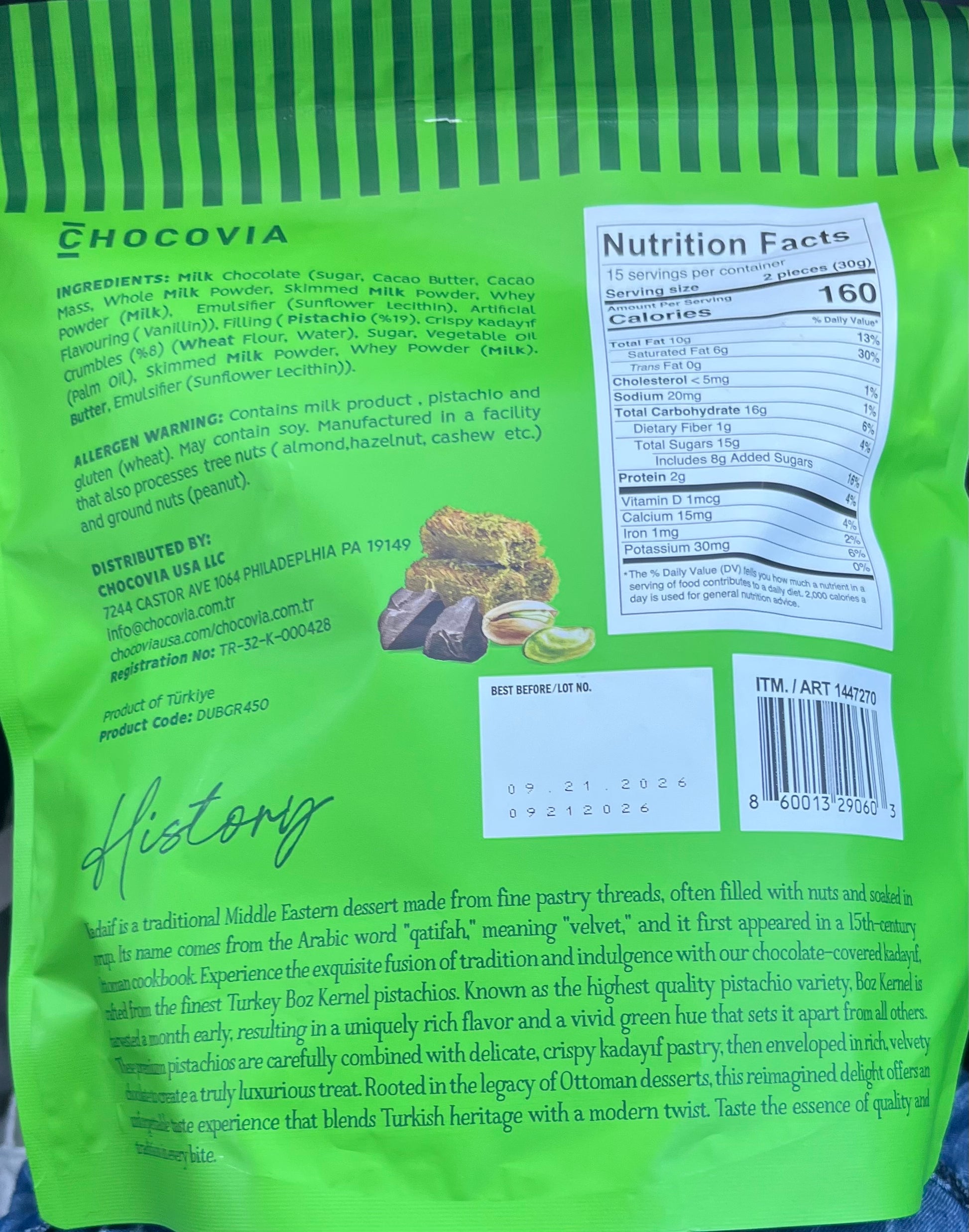 Chocovia Milk Chocolate Pistacho & Kadaif Dubai Style 15.87oz Made in UAE