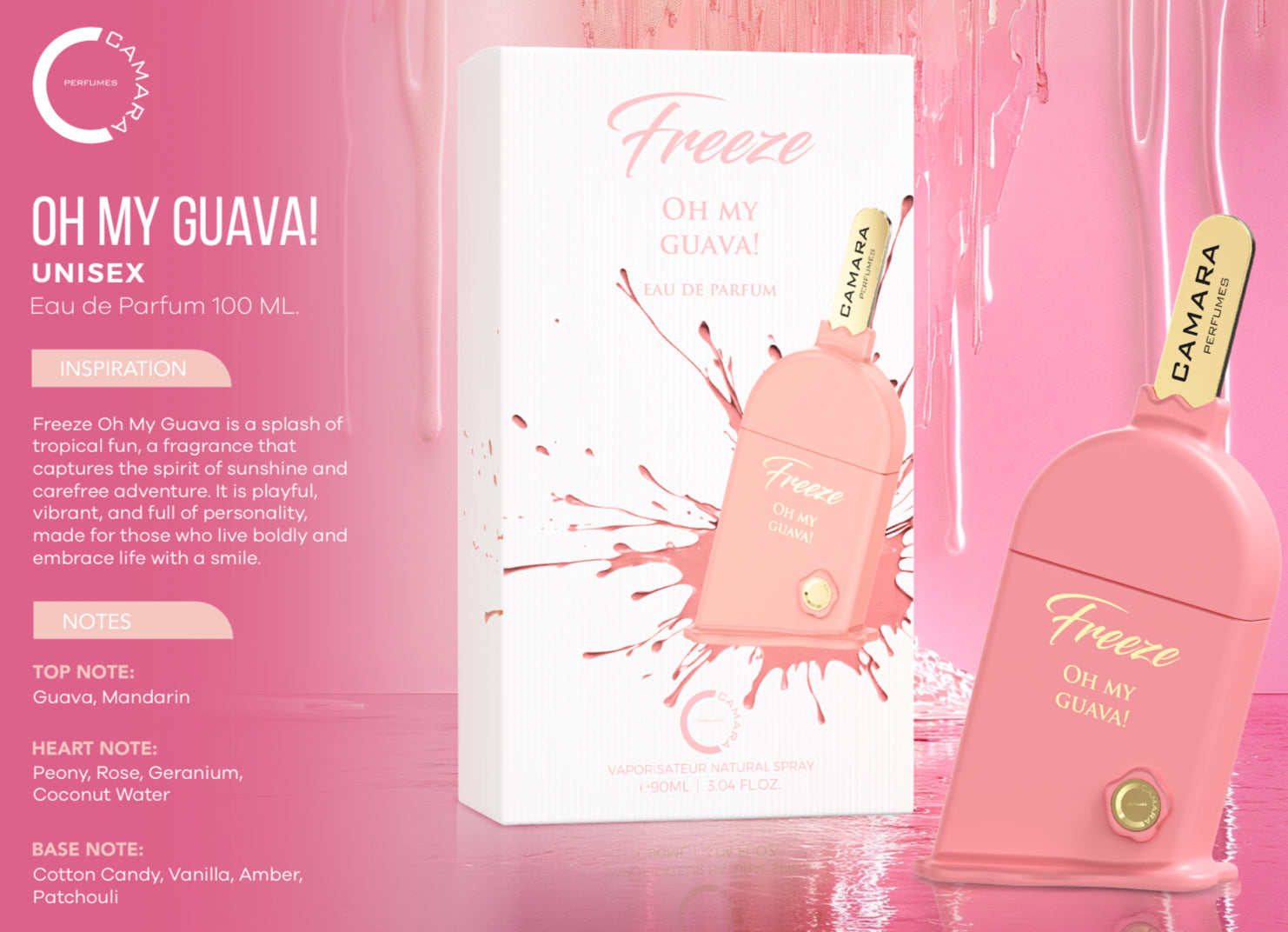 Freeze Oh My Guava is a splash of tropical fun, a fragrance that captures the spirit of sunshine and carefree adventure. It is playful, vibrant, and full of personality, made for those who live boldly and embrace life with a smile.