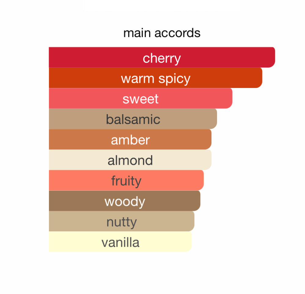 - Notas de salida: Cereza negra, licor de cereza, almendra amarga y jazmín sambac.